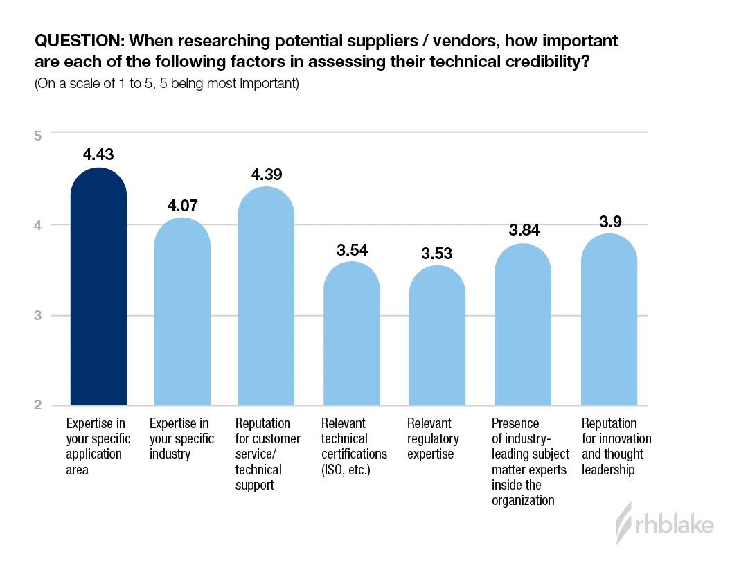 Research from RH Blake’s B2B Manufacturing Buyer Journey Study shows that buyers view application expertise as more predictive of project success than credentials or certifications. It’s proof that you can solve their problem—not just meet standards.